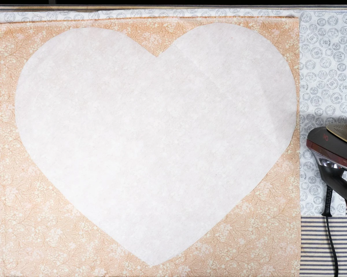 Take a pressing cloth - I use a piece of lightly colored quilting cotton - and place it over the interfacing. It’s ok if the cloth isn’t as big as your panel, just make sure it covers the middle of the heart at the start.
