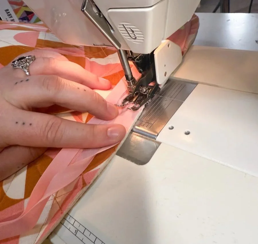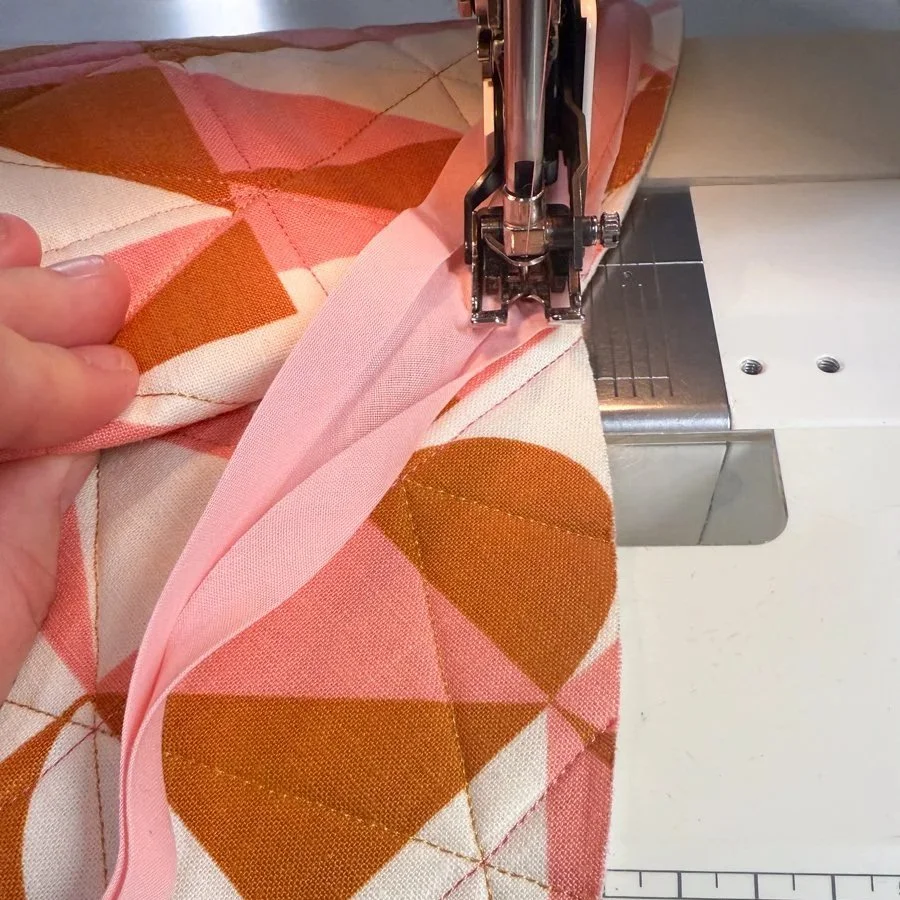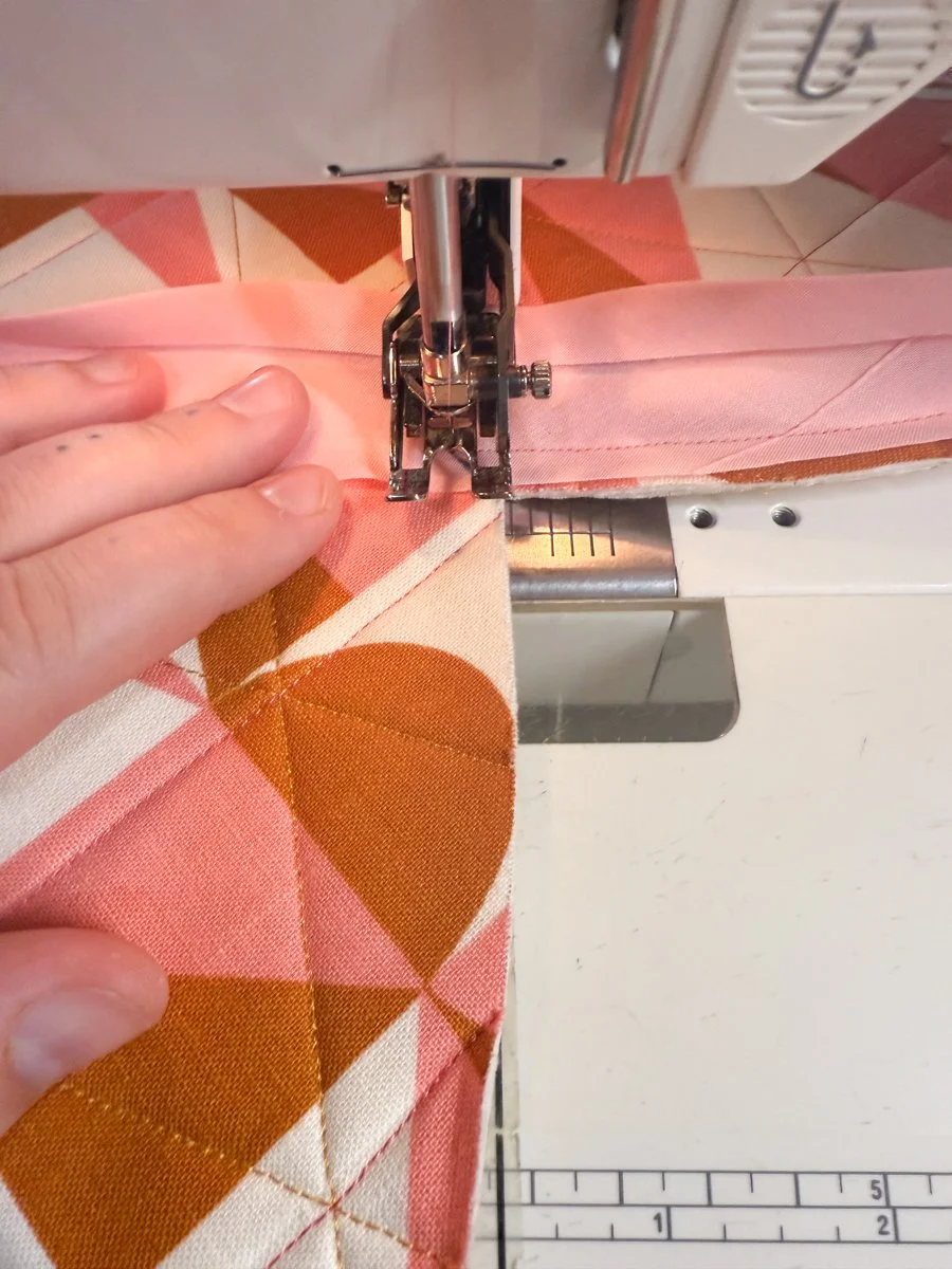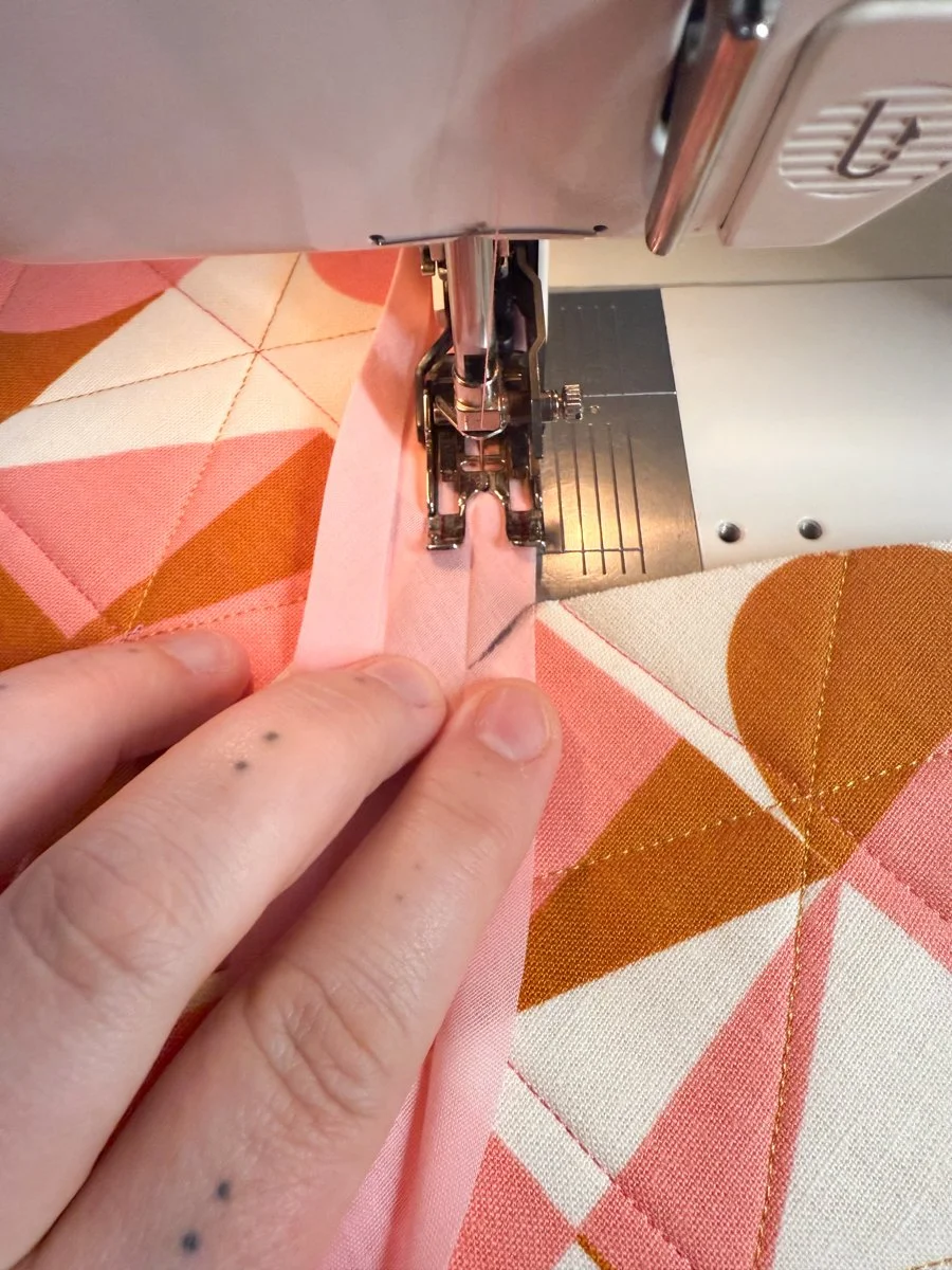 Start sewing along the binding’s crease, about ⅜” away from the edge. I recommend using your walking foot for this step and avoiding clips or pins - it’s best to just move the edge of the binding as you sew. Go slow and steady, there’s no rush!