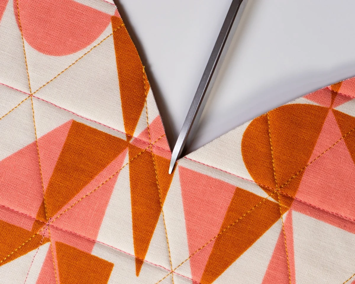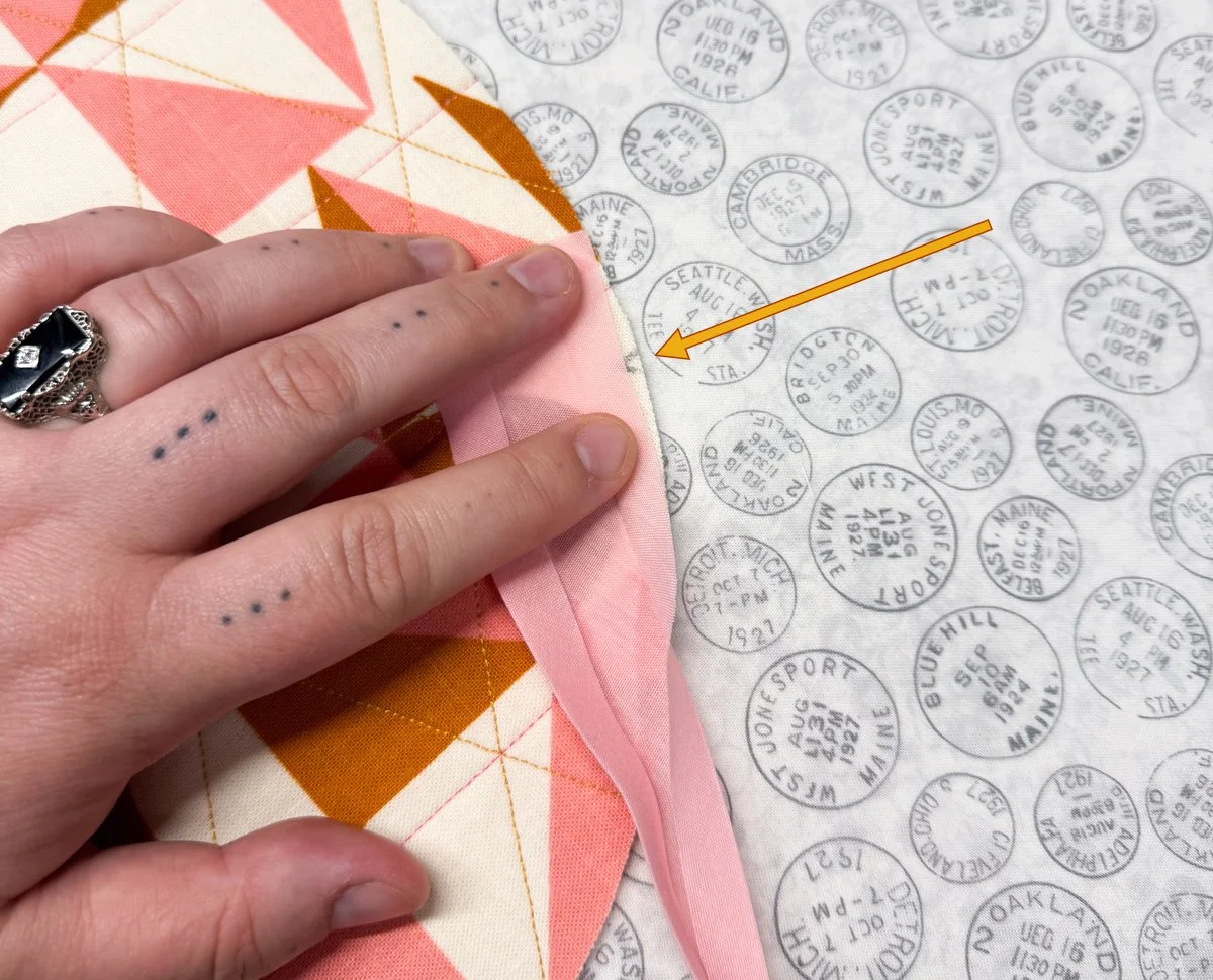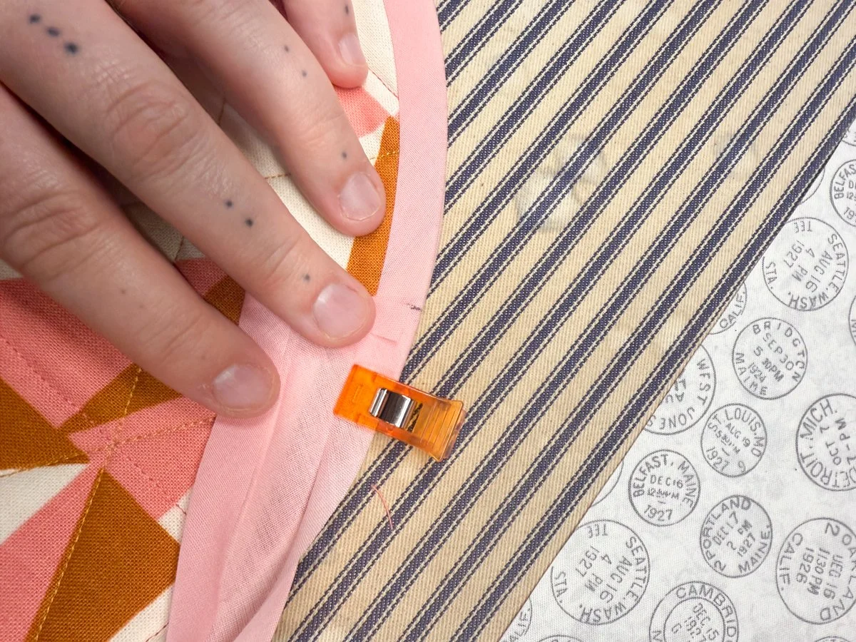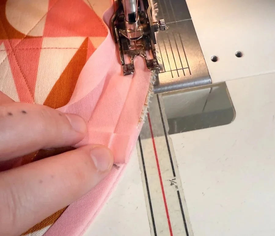 Start sewing along the binding’s crease, about ⅜” away from the edge. I recommend using your walking foot for this step and avoiding clips or pins - it’s best to just move the edge of the binding as you sew. Go slow and steady, there’s no rush!