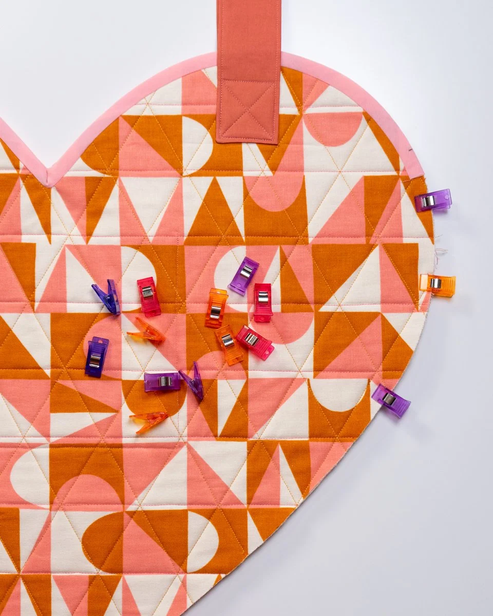 This bag came out of a fever dream and frustration at not finding a pattern that fit my vision. I searched for heart bag patterns, but they all were too small, had 80 pockets I’d never use or required a zipper - a big no thanks. I wanted a bag that was oversized for shoving things in without having to undo a zip, plus I wanted it to be so easy that I could sew it the day before Quiltcon. Thus, the Giant Heart Bag pattern was born!