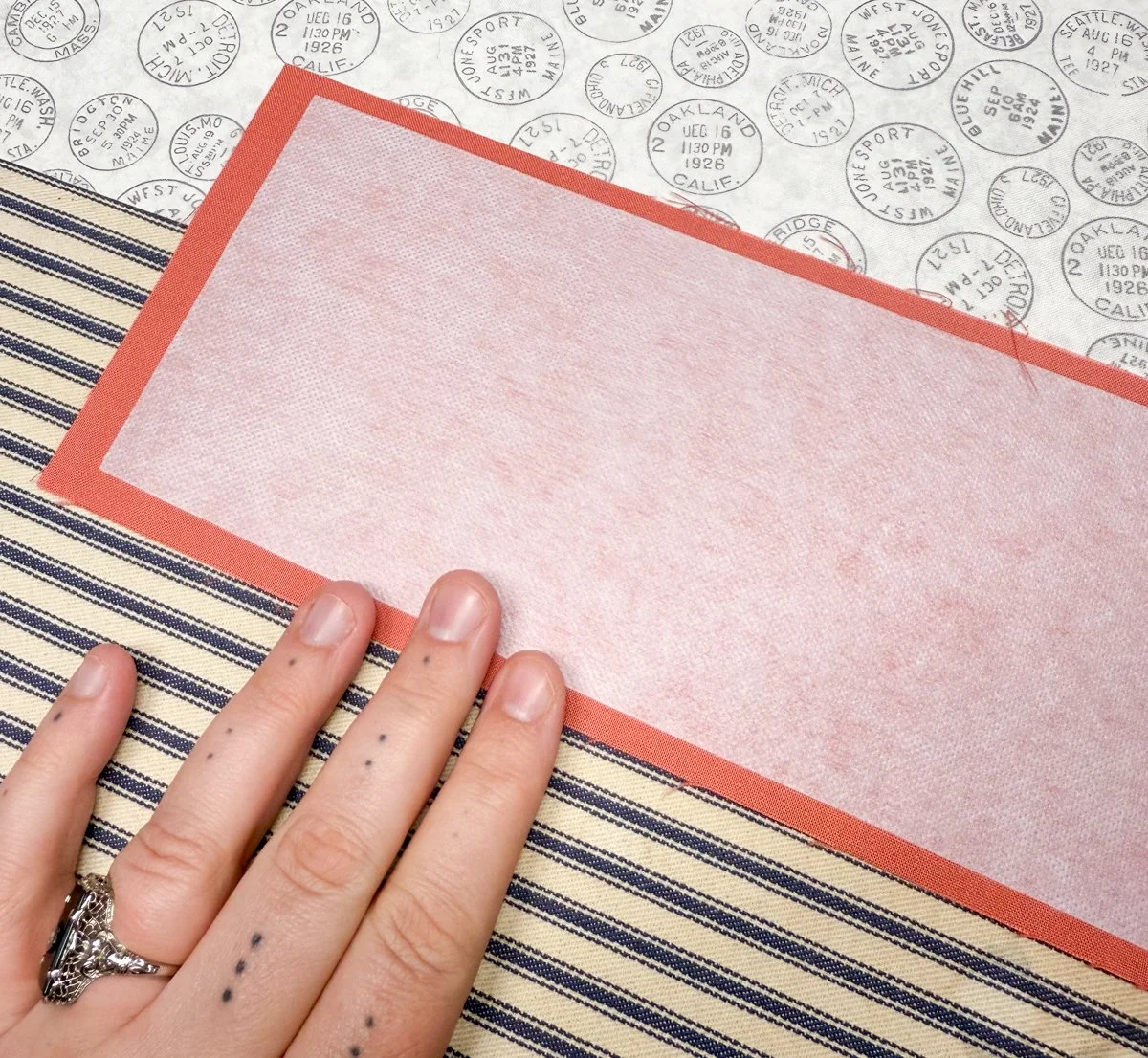 Here you can see that interfacing is about ¼" from each edge. It’s ok if it’s not perfect - this is a long strip, it’s hard to get it centered exactly!