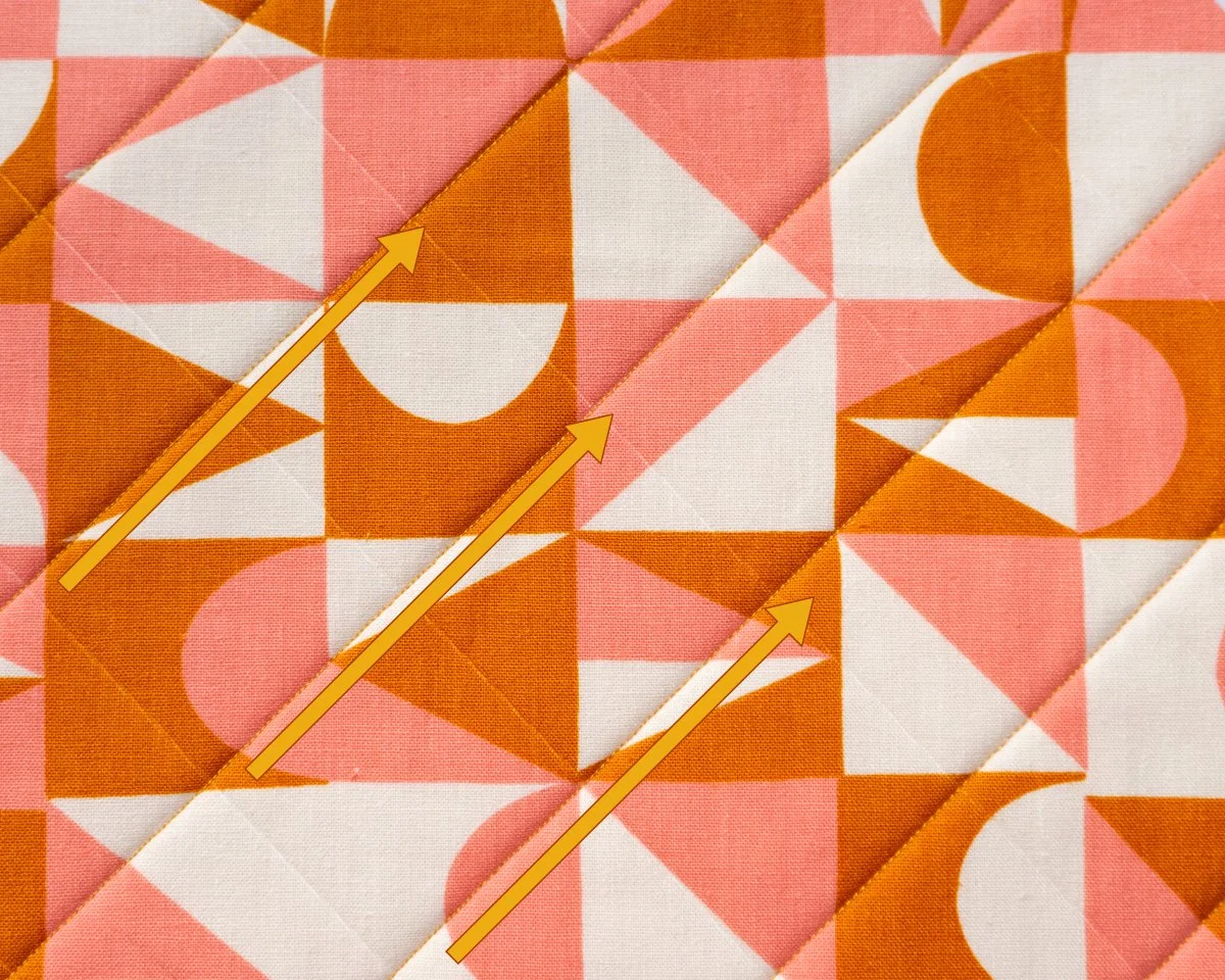 I recommend quilting in one direction to avoid directional puckering lines. If you sew down one side, then turn the bag and sew down a parallel line, you can sometimes create angled puckering lines. Even though it requires more time, I recommend sewing a line in one direction, pulling the panel out of the machine, then repositioning it back at your machine starting at the same side your previously started at. It’s hard to type that out clearly, so I drew a diagram below to help explain what I mean: