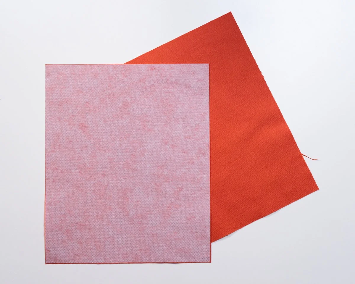 Start by attaching your interfacing to the wrong side of one pocket piece. It will be ½” smaller than your pocket pieces, so try to center it as best your can - you should have about ¼” of fabric visible on every side.