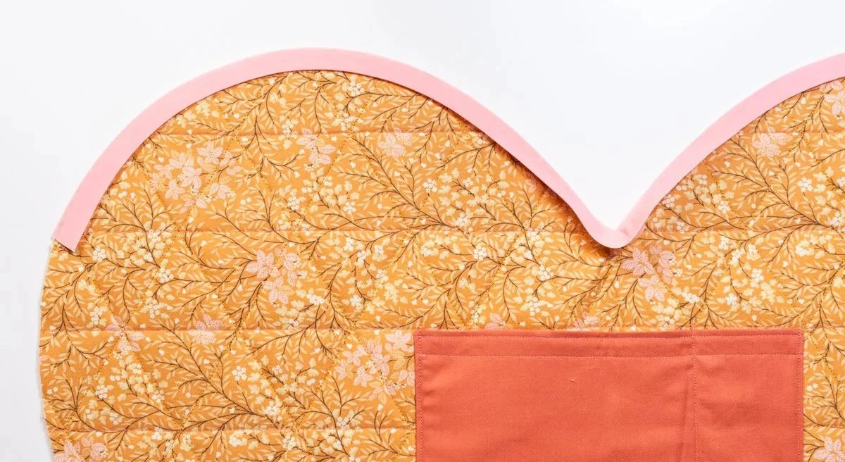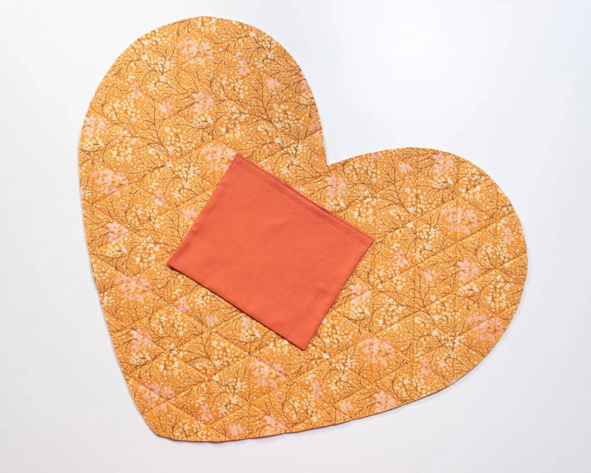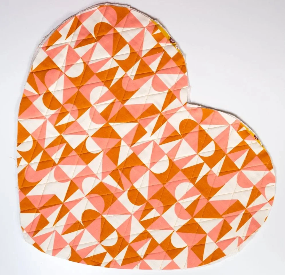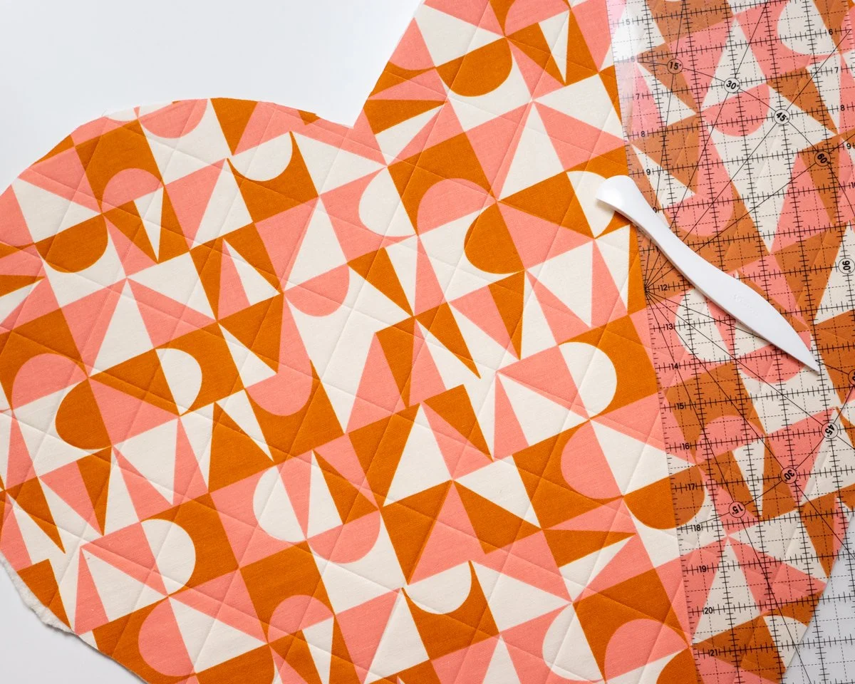 Once you’re done quilting, lay down your heart template on your quilted panels and mark around it. Cut out your 2 quilted panels. Mark the two opening points (represented as little triangles on your heart template) - they’ll be covered with binding later, so don’t worry about using a removable market. You should have 2 heart shaped panels!