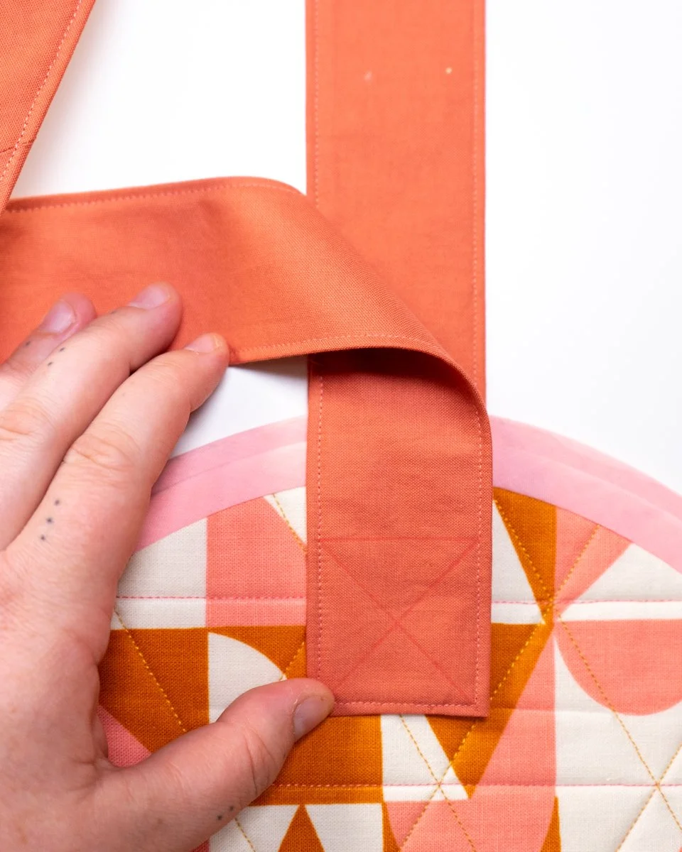 The strap attachment, like the pocket attachment, is a bit up to you. One lady at Quiltcon told me she wished the straps were closer to the edge of the bag, another mentioned she wanted them to be lower on the bag to make them sturdier. I’m going to give you my basic instructions for attachment, but feel free to go rogue - this is your bag, so stitch it your way!