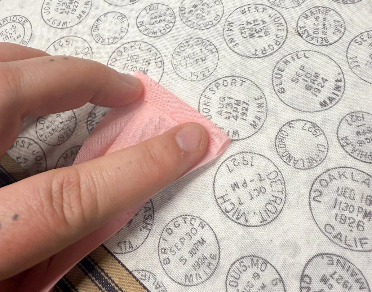 Note: If you’ve never done this, it’s a bit awkward and takes some practice to get right. You want to fold the fabric INWARDS a ¼” and iron it down carefully. This is another reason why cutting your interfacing ½” smaller than your pocket panel is so useful - it acts like a guide for ironing down your seam allowance!
