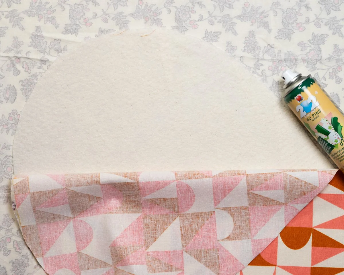 Flip your batting piece over so the outer fabric is now face down and the remaining batting side is face up. Place the lining/interfacing on top, interfacing side down. Lift up half of the lining, spray the batting with basting spray, then immediately press it back down. Repeat for the other half of the batting/lining fabric.