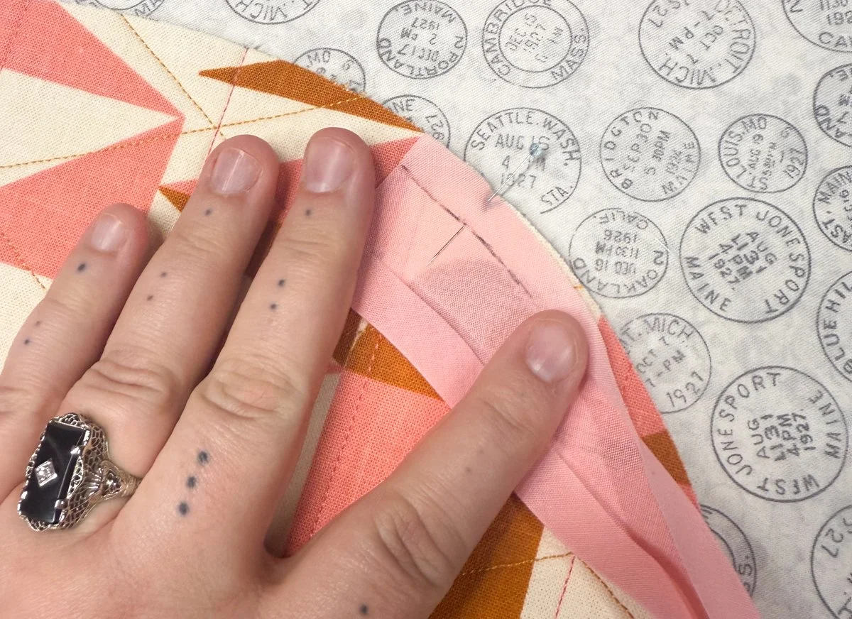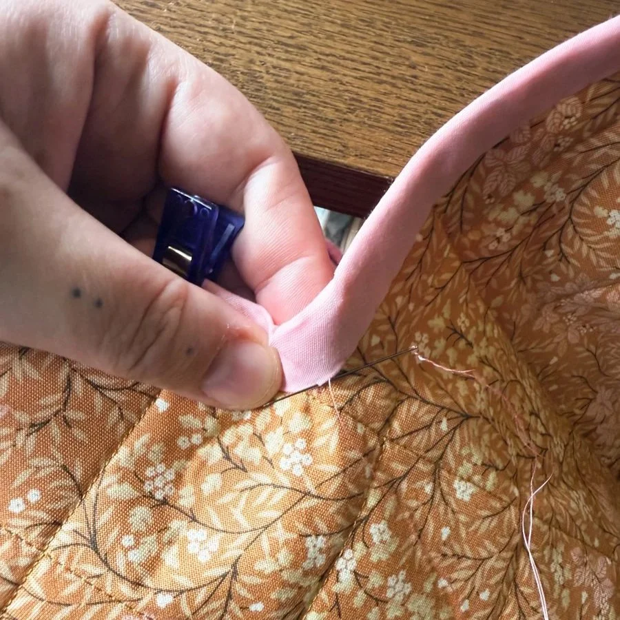 Sewing the dip down is a little tedious, but only requires a little creative adjusting! Since I hand sew my binding - yes, even on bags like this - here’s a look at how I get the dip to sew down: