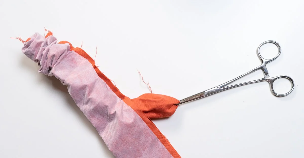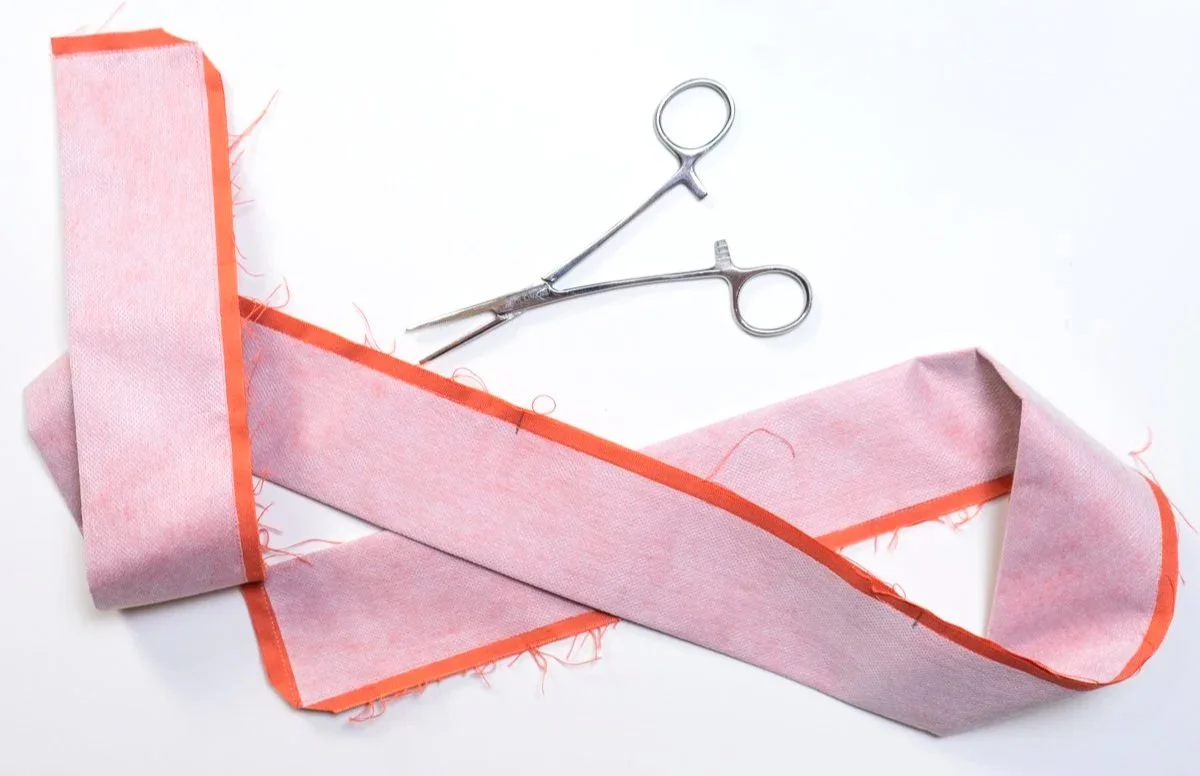 Turn the strips right side out using the 4-6” opening. Take your time, this process is tedious and can get frustrating! I like to use a hemostat to grip the strap end from the inside of the tube, then pull it through the opening: