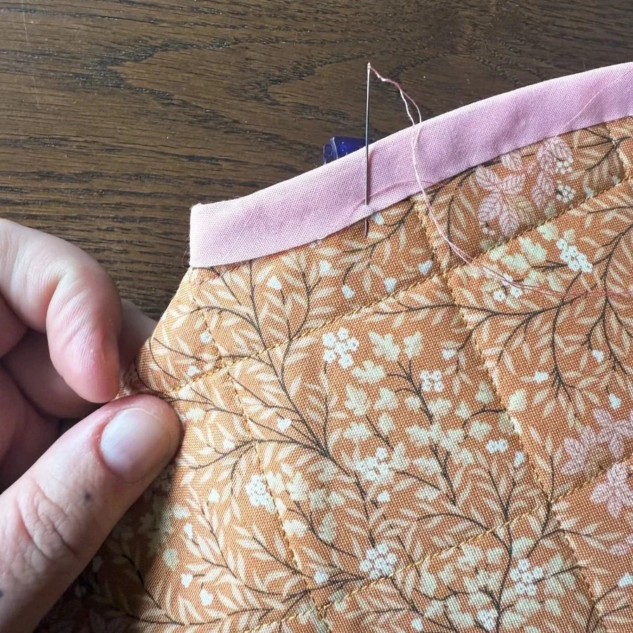 Note: I like to hand sew my binding down and for this bag, it’s especially useful. At the two ends of the binding, I sew down the ENDS as well! This keeps the folded binding tucked under the edge - you might have noticed that it can kind of stick out.