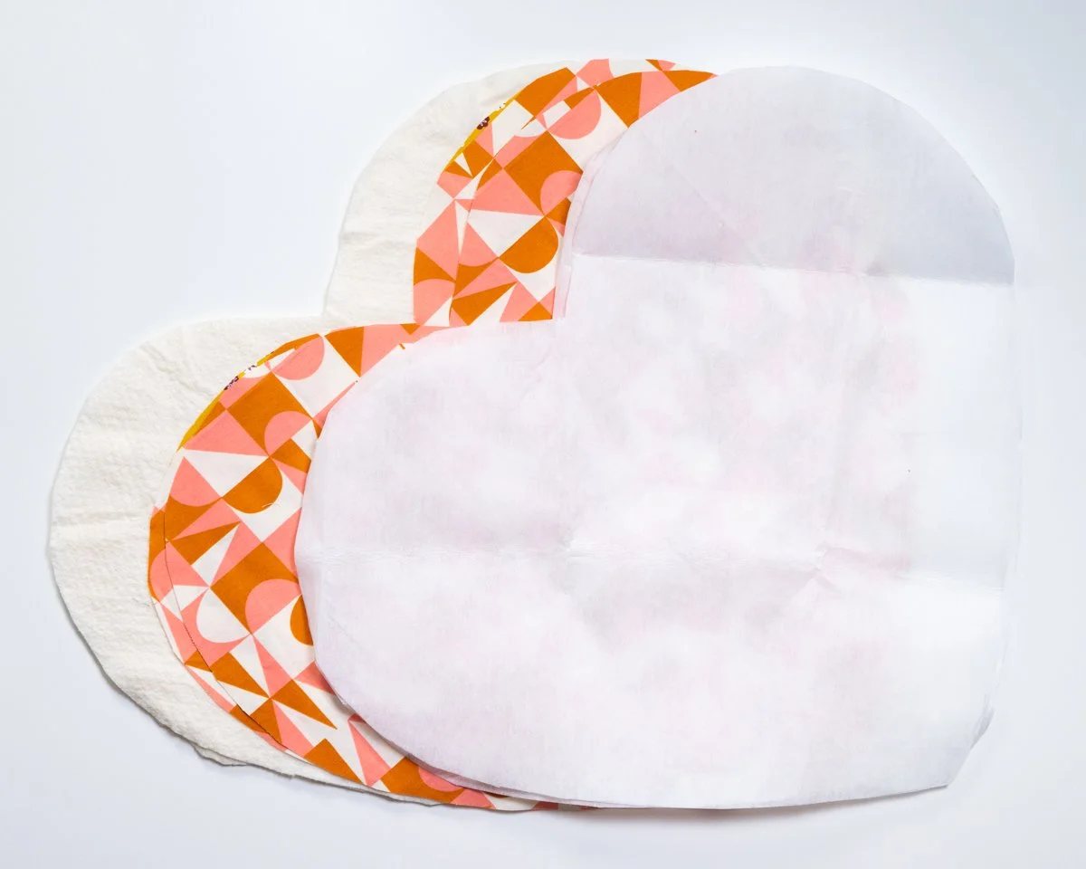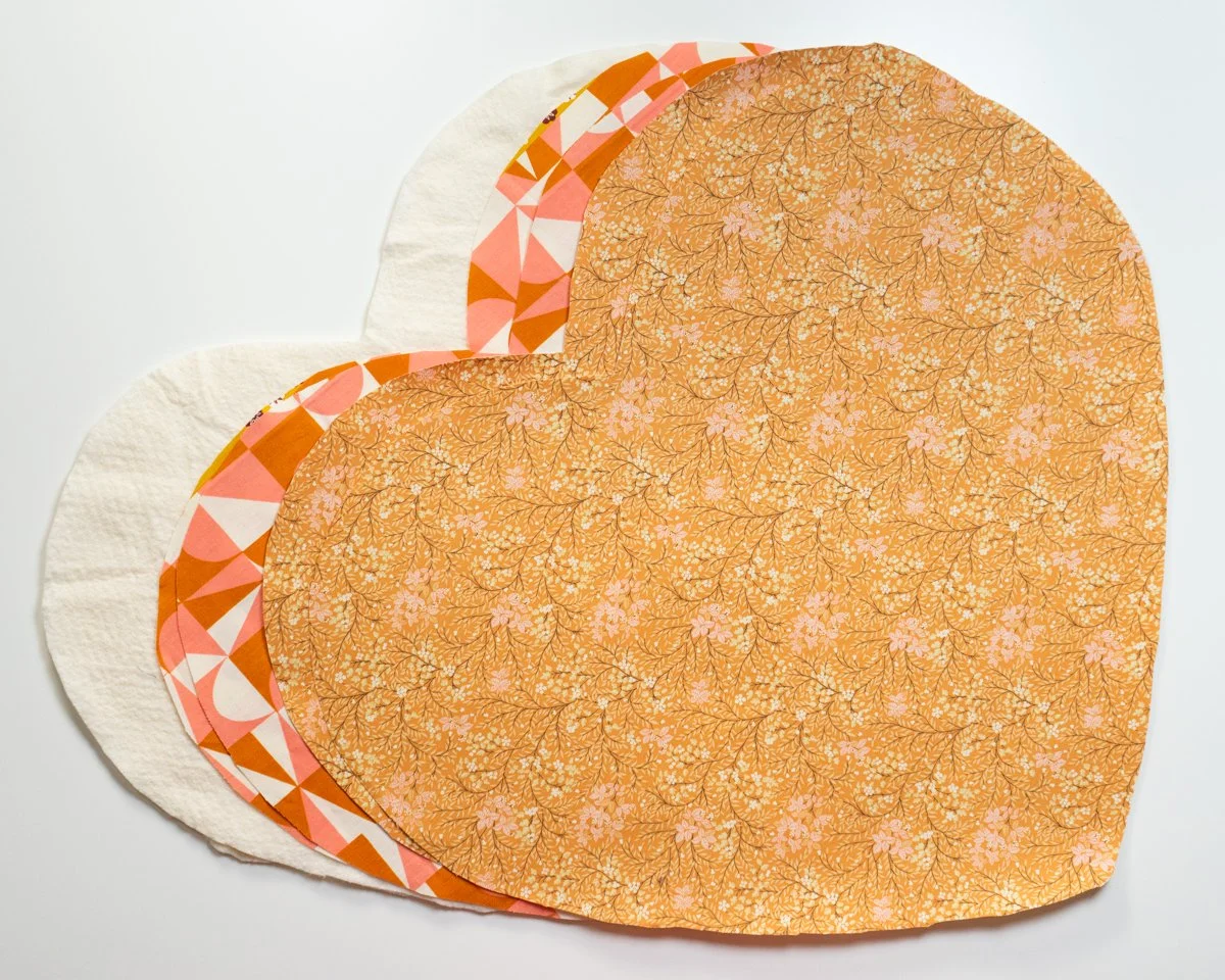 Start by laying a batting piece on a flat surface. Lay an outer fabric pieces on top of the batting, lining up the edges of the heart (don’t worry if it’s not perfect). Lift up half of the outer fabric to reveal the batting underneath: