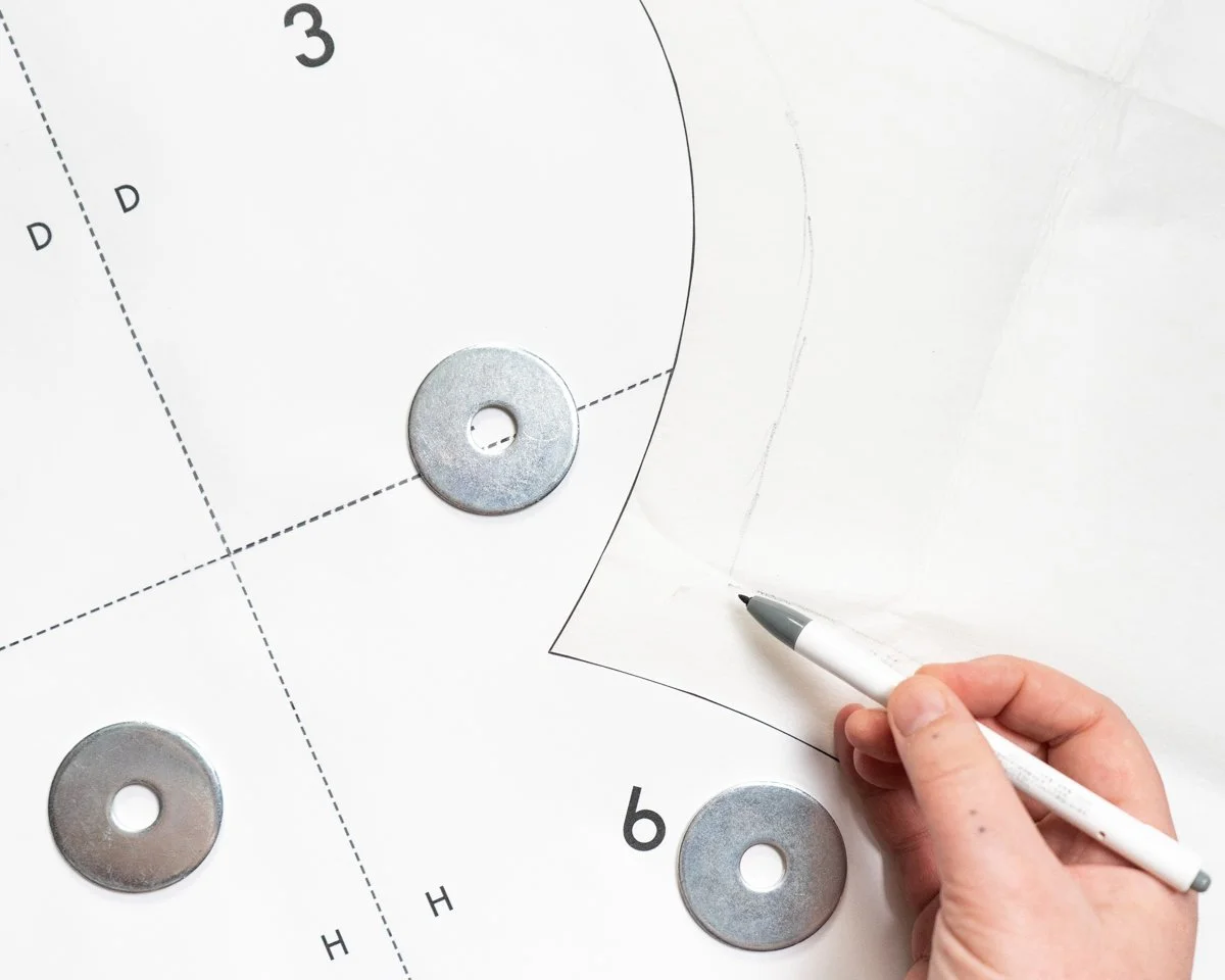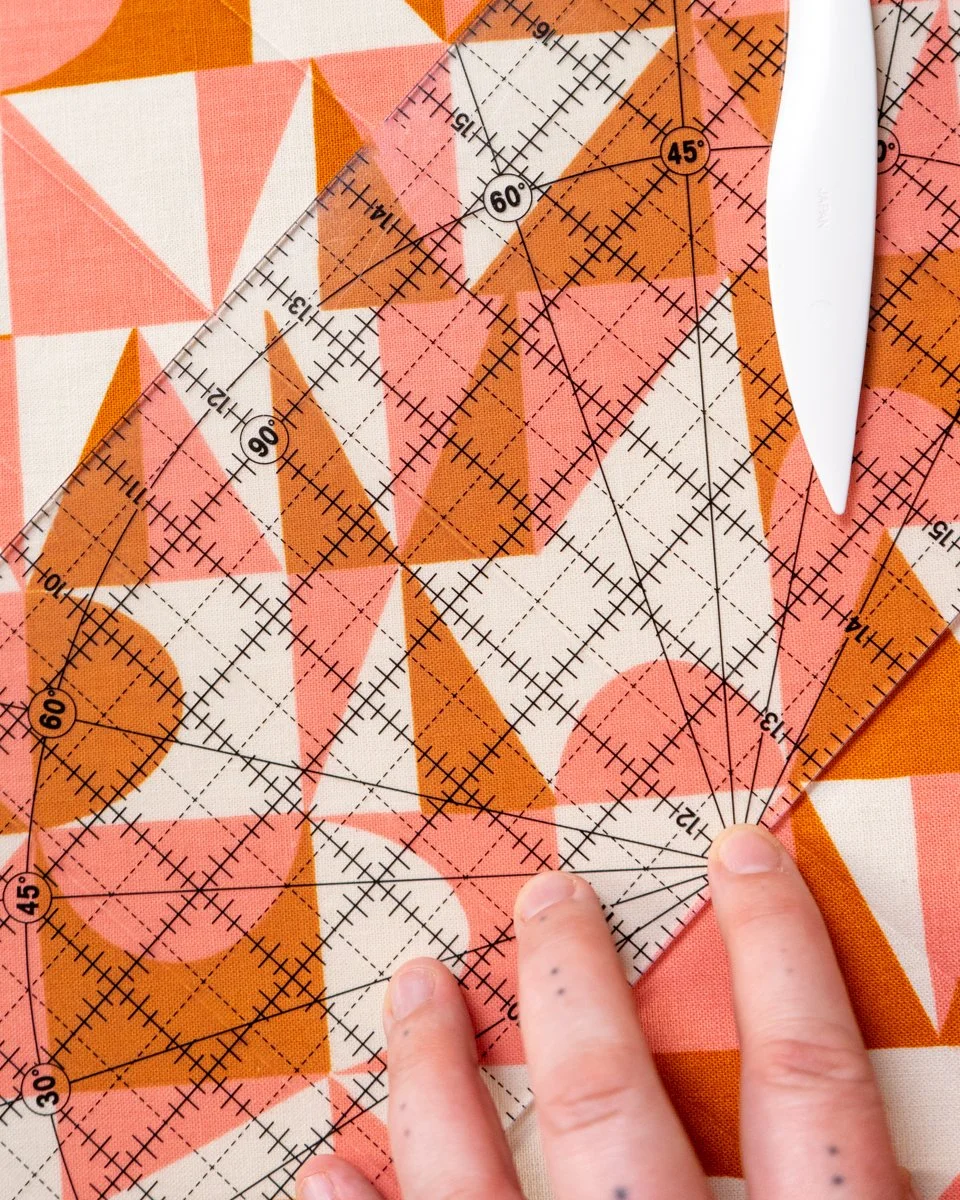 The red line is where the template would be cut out, which you’ll notice is just over half of the WOF (width of fabric). Rather than cutting both pieces at once, open your fabric from its standard half WOF fold and cut your pieces individually.