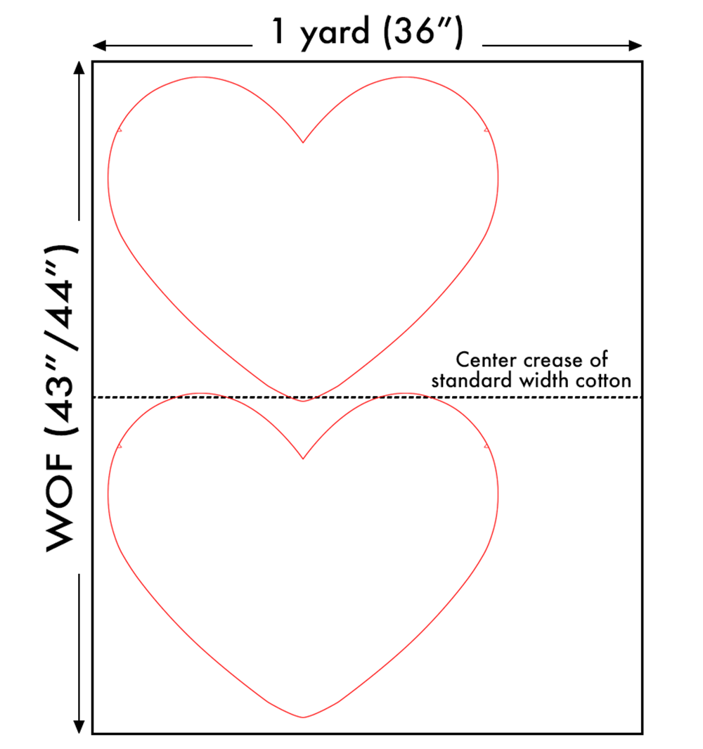 Place one interfacing heart, shiny side down, on top of your lining fabric. Make sure it’s as close to the selvedge as possible - a little overlap is ok! Remember, you cut an inch around your template that will be trimmed down after quilting.