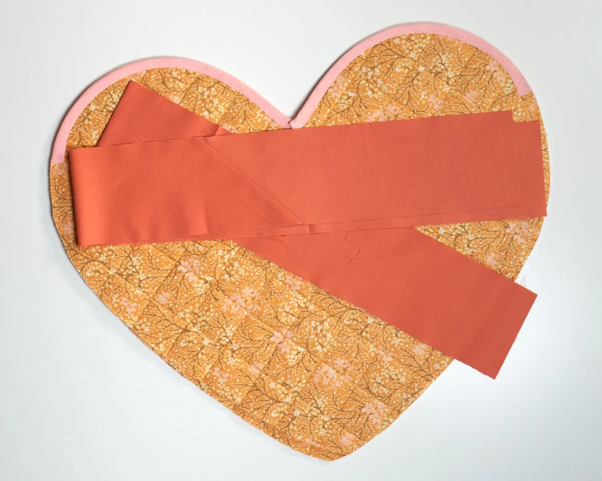 The points you marked on your heart panels are where the top binding will start and end. Start by cutting two 29” pieces of binding, one for each panel.